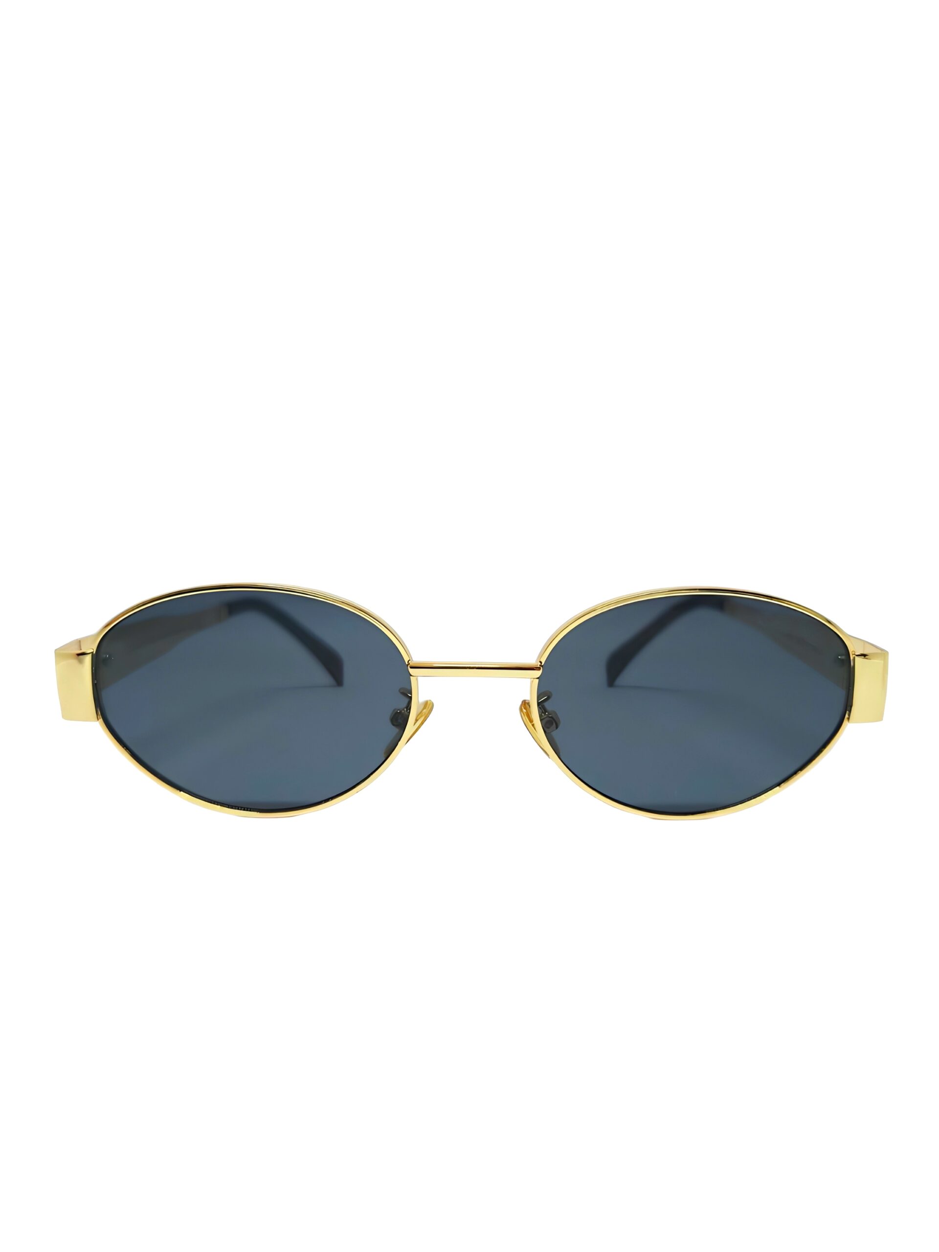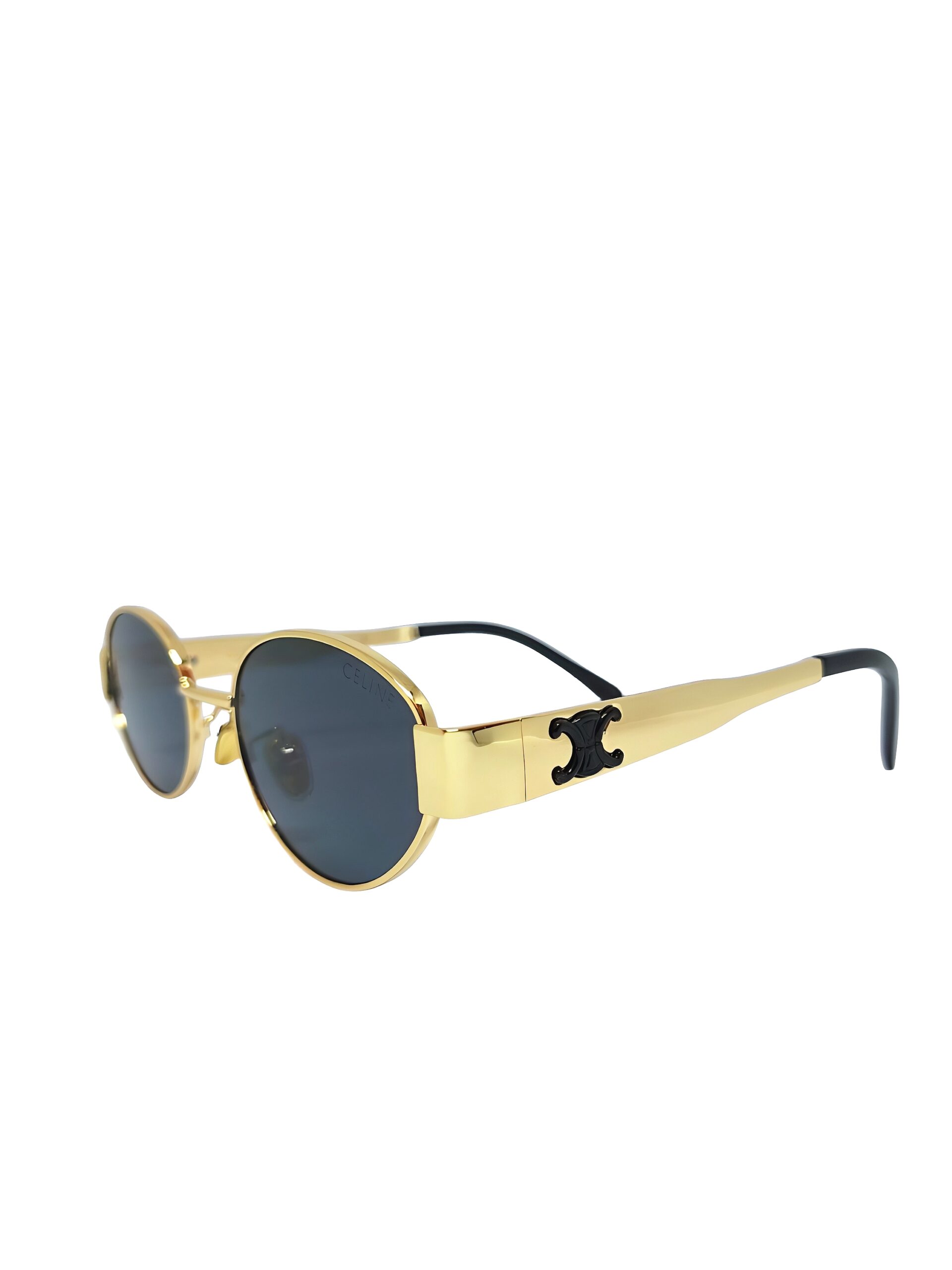 The Celine Triomphe Metal 01 CL40235U sunglasses are a luxurious and popular fashion item featuring a distinctive oval shape and a shiny yellow gold metal frame. These sunglasses are designed for women and are identifiable by the iconic Triomphe emblem displayed on the temples. The lenses typically come in a green or grey tint and offer 100% UVA/UVB protection, blending a timeless aesthetic with modern luxury.