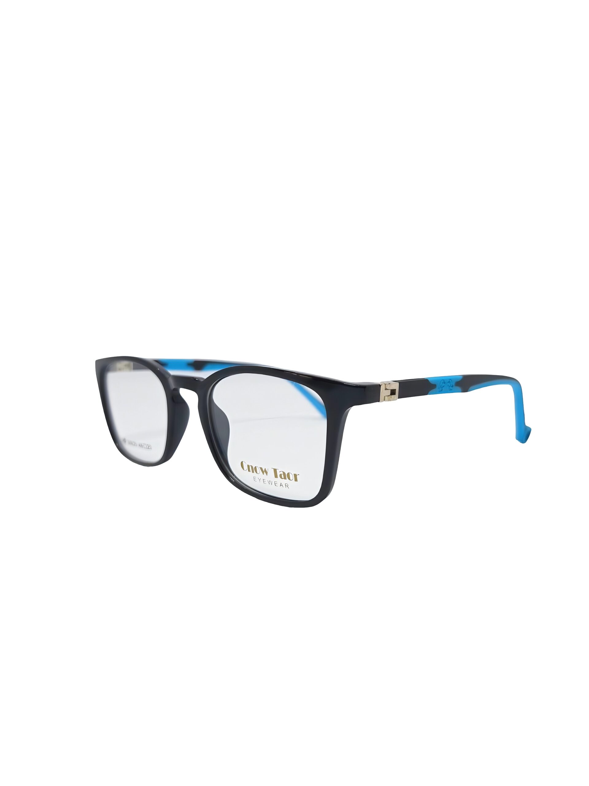 A modern pair of Crow Taor eyeglasses featuring a rectangular black frame with slightly rounded edges. The temples showcase a bold black-and-blue camouflage pattern with blue accents on the inner sides and tips, adding a stylish contrast. Clear lenses display the brand name in gold on the right lens, while metallic hinges enhance durability and sophistication. This design blends contemporary flair with everyday functionality.