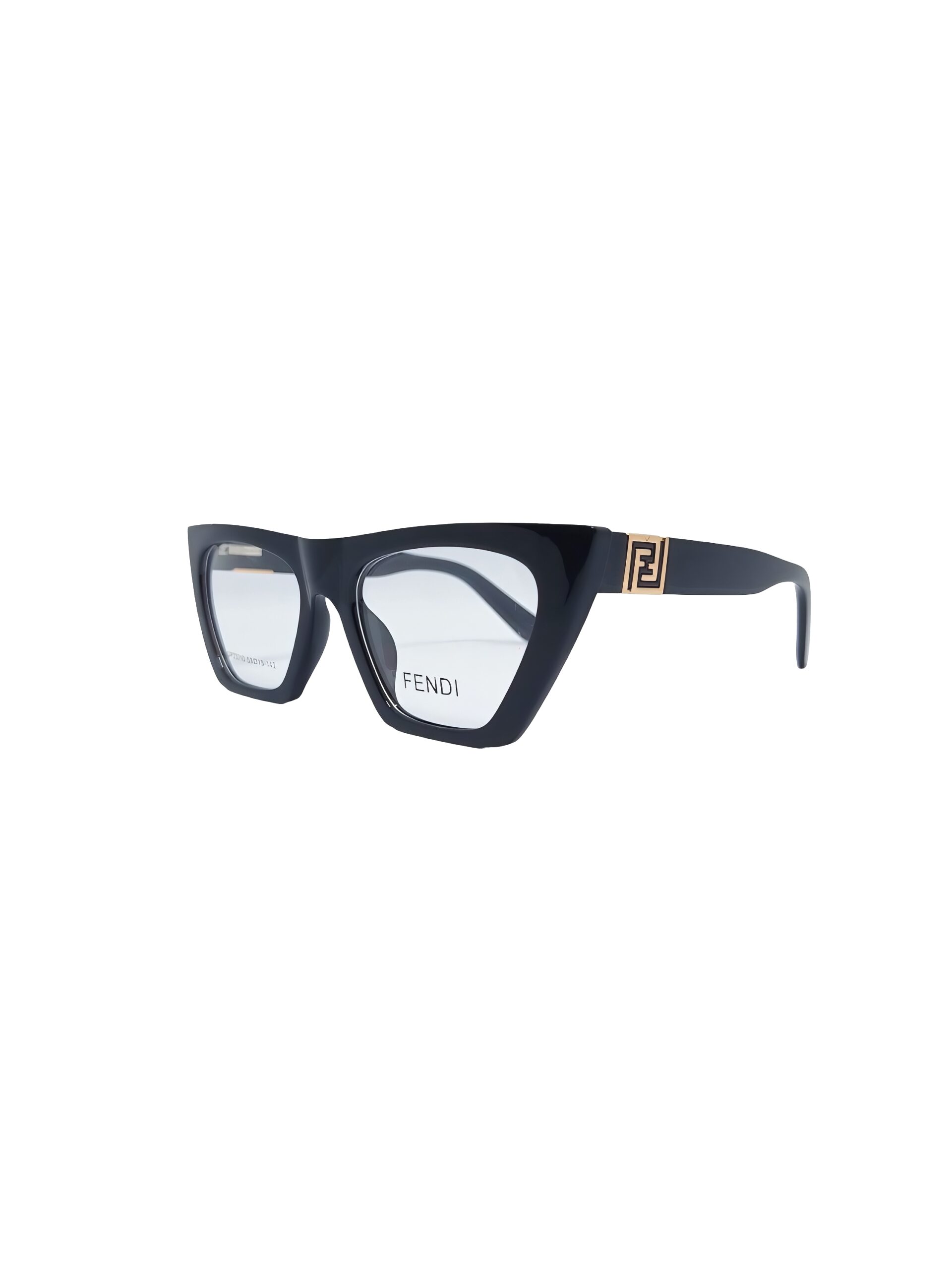 A bold pair of Fendi eyeglasses featuring a striking angular cat-eye silhouette in glossy black. The clear lenses highlight the Fendi logo on the right lens, while the left lens displays the model and size details (53□19-142). This design combines sharp modern styling with luxury craftsmanship, making it a standout accessory for both professional and fashion-forward wear.