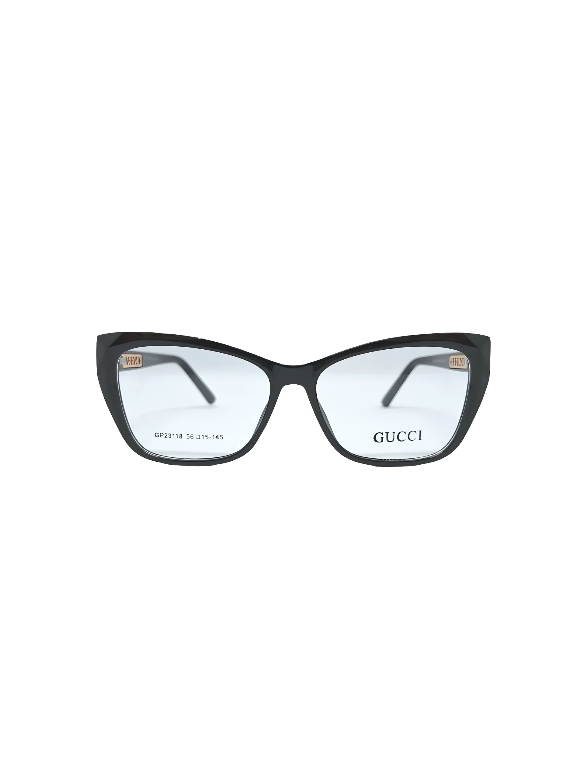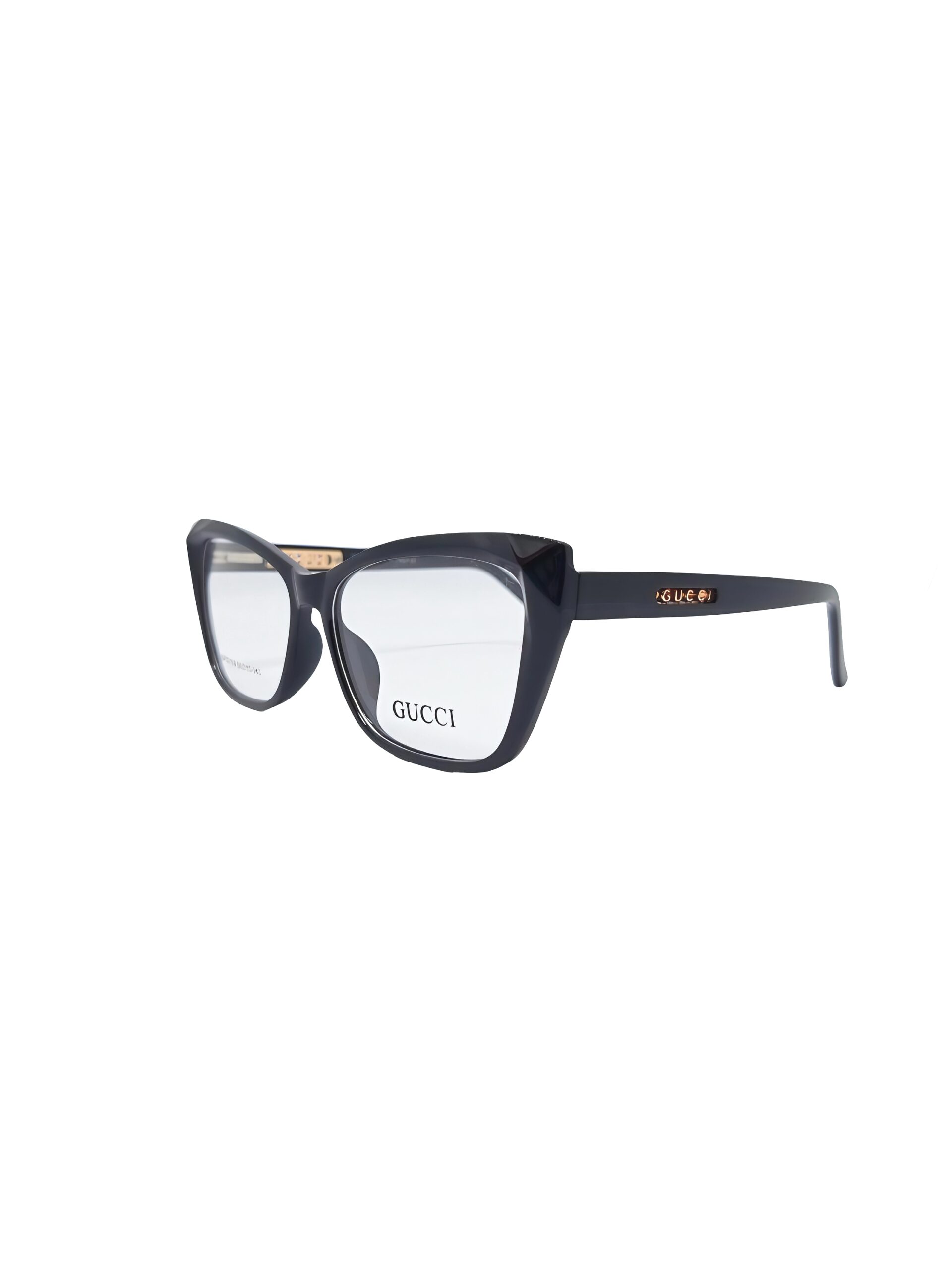 A sleek pair of Gucci eyeglasses featuring a transparent gray cat-eye design. The clear lenses display the Gucci logo on the right lens, while the left lens includes the model and size details (56□15-145). This modern style blends subtle elegance with luxury branding, making it a versatile accessory for both fashion and everyday wear.