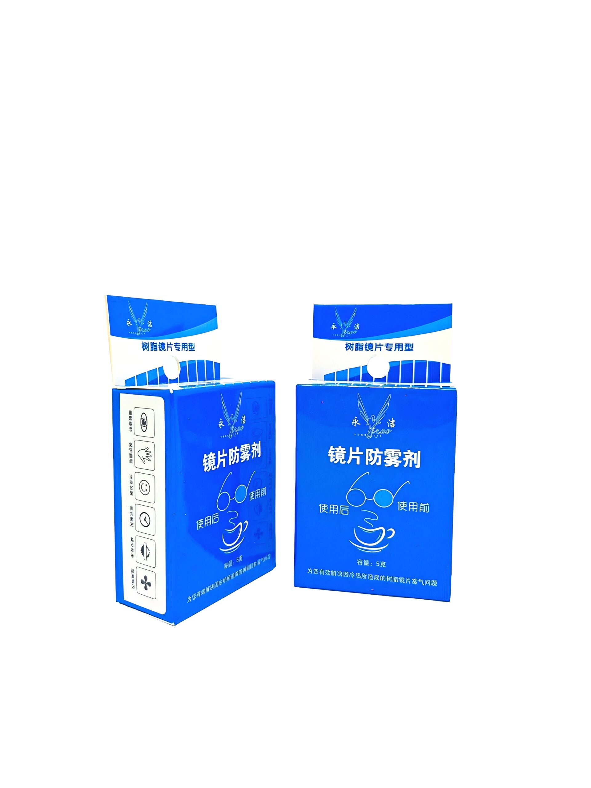 It is a “special type for resin lenses” (树脂镜片专用型). It is designed to effectively prevent the fogging of various types of lenses, such as eyeglasses, sunglasses, and goggles, which often occurs due to temperature differences or humidity. The packaging shows a visual comparison of a clear lens after use versus a fogged lens before use.