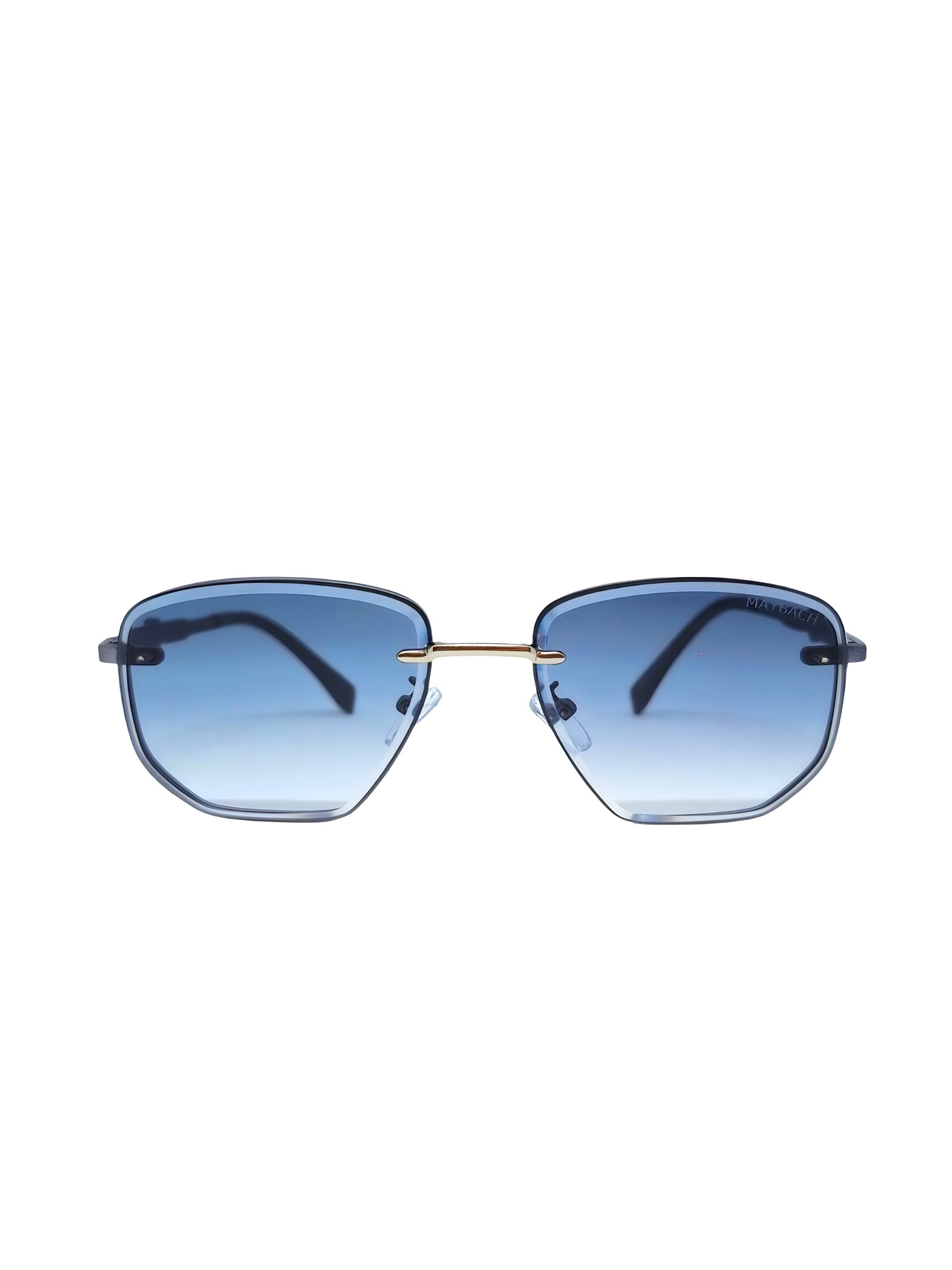 A luxurious pair of Maybach sunglasses featuring a rimless geometric frame design with a metallic gold bridge for added elegance. The lenses have a refined blue gradient tint, while the black temples curve slightly for comfort. Subtle Maybach branding engraved on the lens underscores the exclusivity of this high-end accessory, blending modern sophistication with premium craftsmanship.