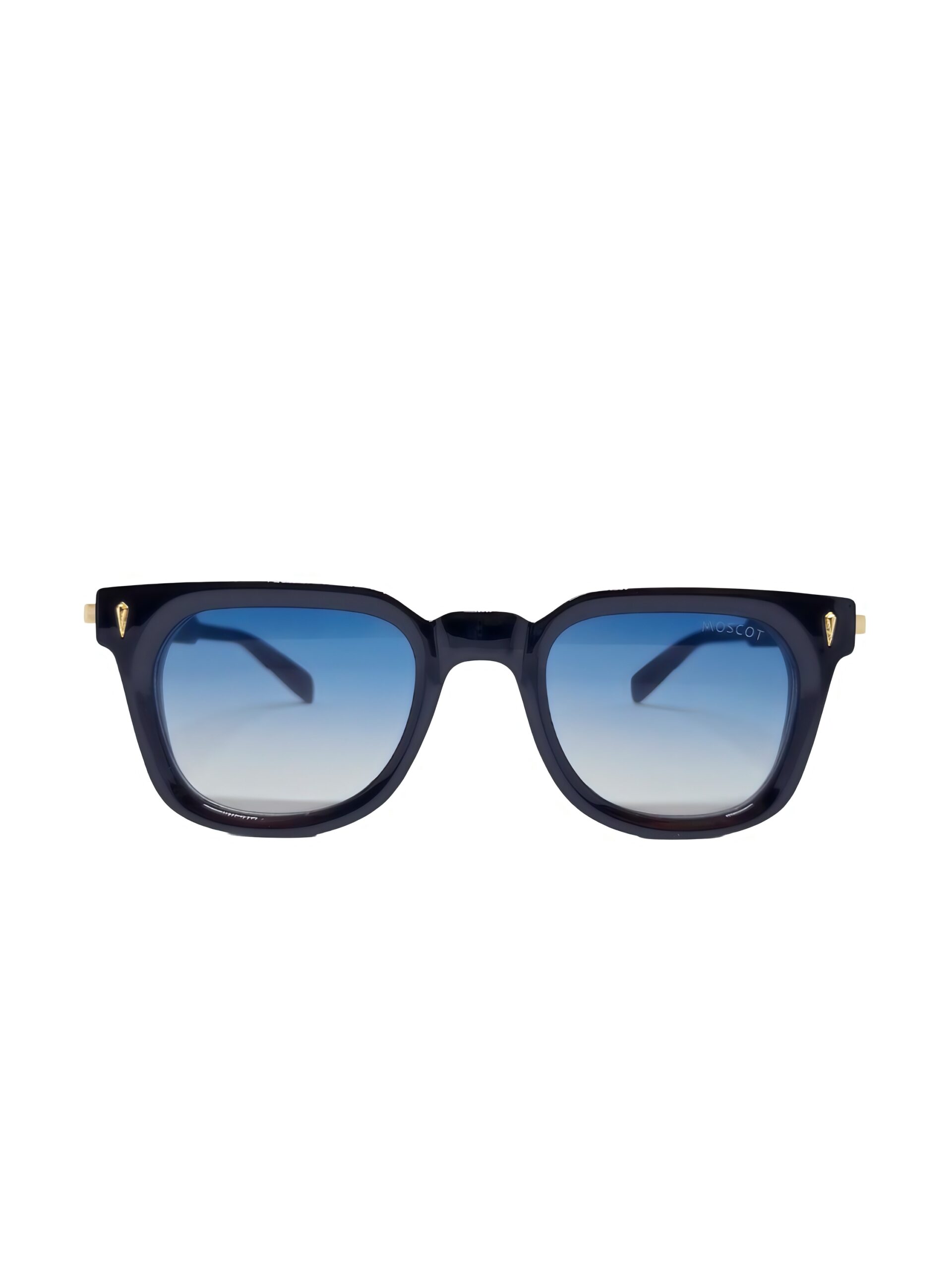 A stylish pair of Moscot sunglasses featuring a classic rectangular frame in dark tones, accented with subtle gold detailing near the hinges. The lenses have a gradient blue tint, transitioning from deep navy at the top to lighter blue at the bottom, offering both sun protection and a modern aesthetic. This design blends timeless craftsmanship with contemporary flair, making it a versatile luxury accessory.