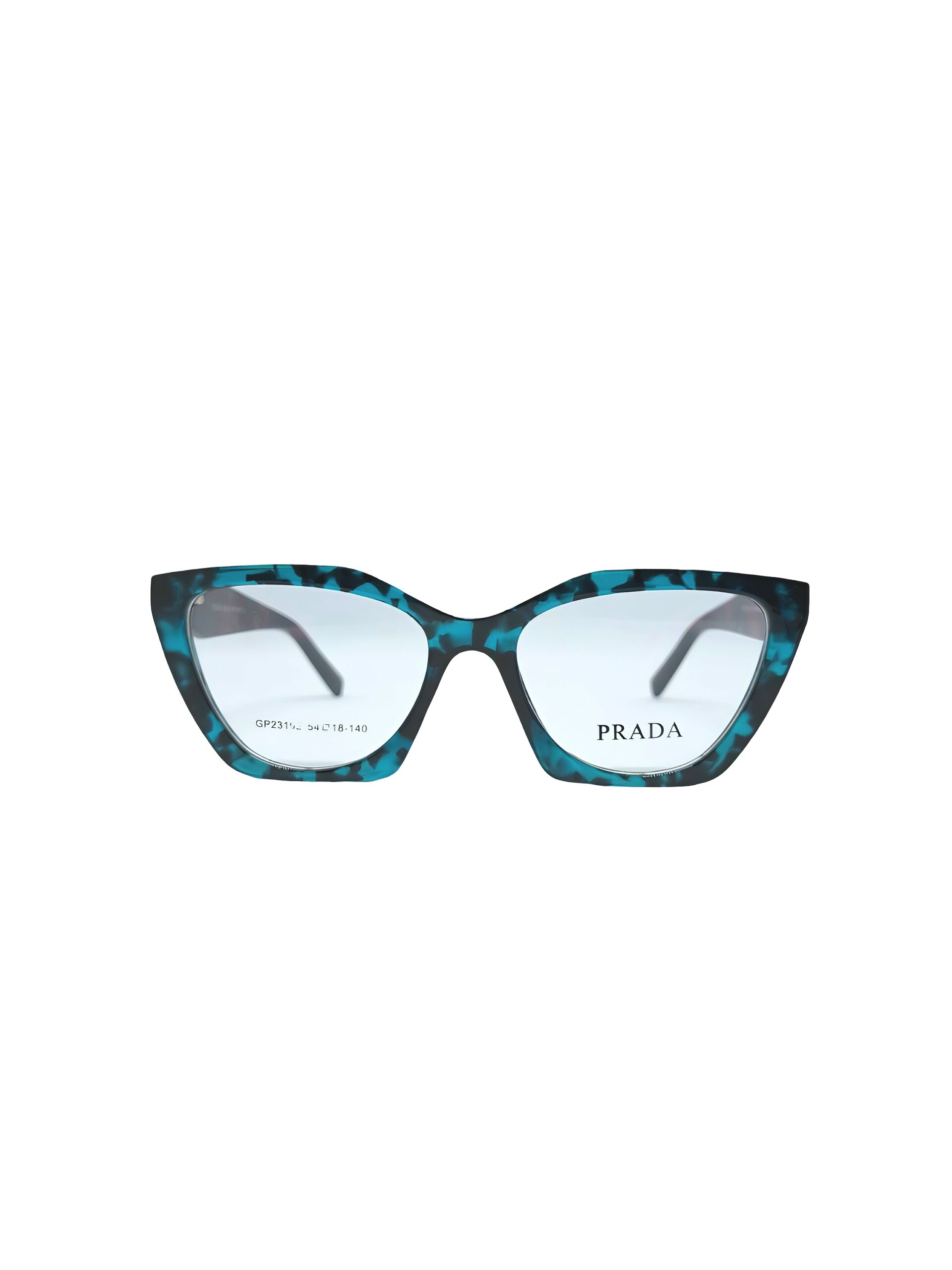 A bold Prada eyeglass design featuring a striking cat-eye silhouette. The frame showcases a distinctive blue and black tortoiseshell pattern, giving it a luxurious and artistic flair. Clear lenses highlight the Prada logo on the right lens, while the left lens displays the model and size details (54□18-140). This style blends high-fashion elegance with a modern edge, making it a standout accessory for trendsetters.